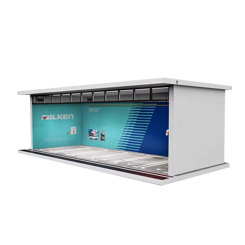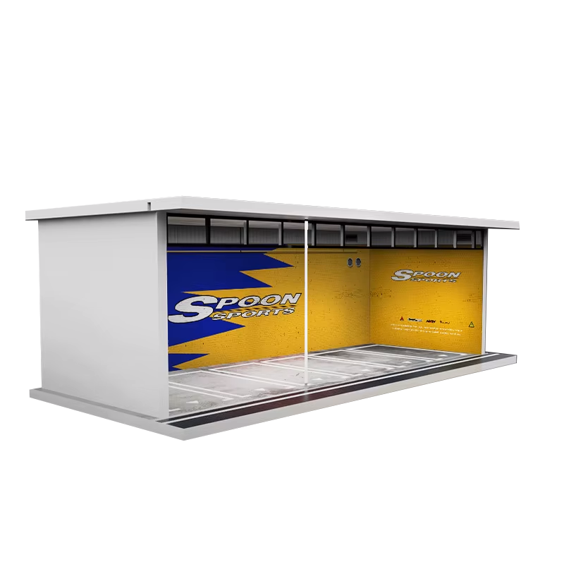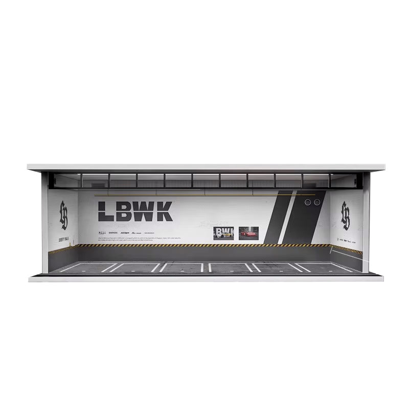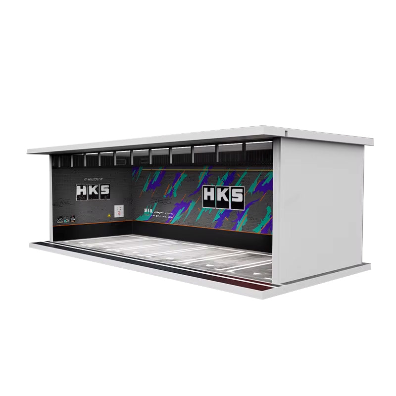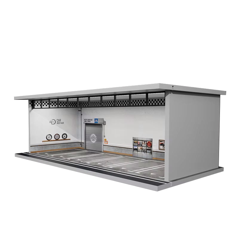1/64 Scale Diorama with LED interior lights and sliding clear acrylic door! Garages are stackable and lighting can be linked/Chained in connection to easily run one USB.